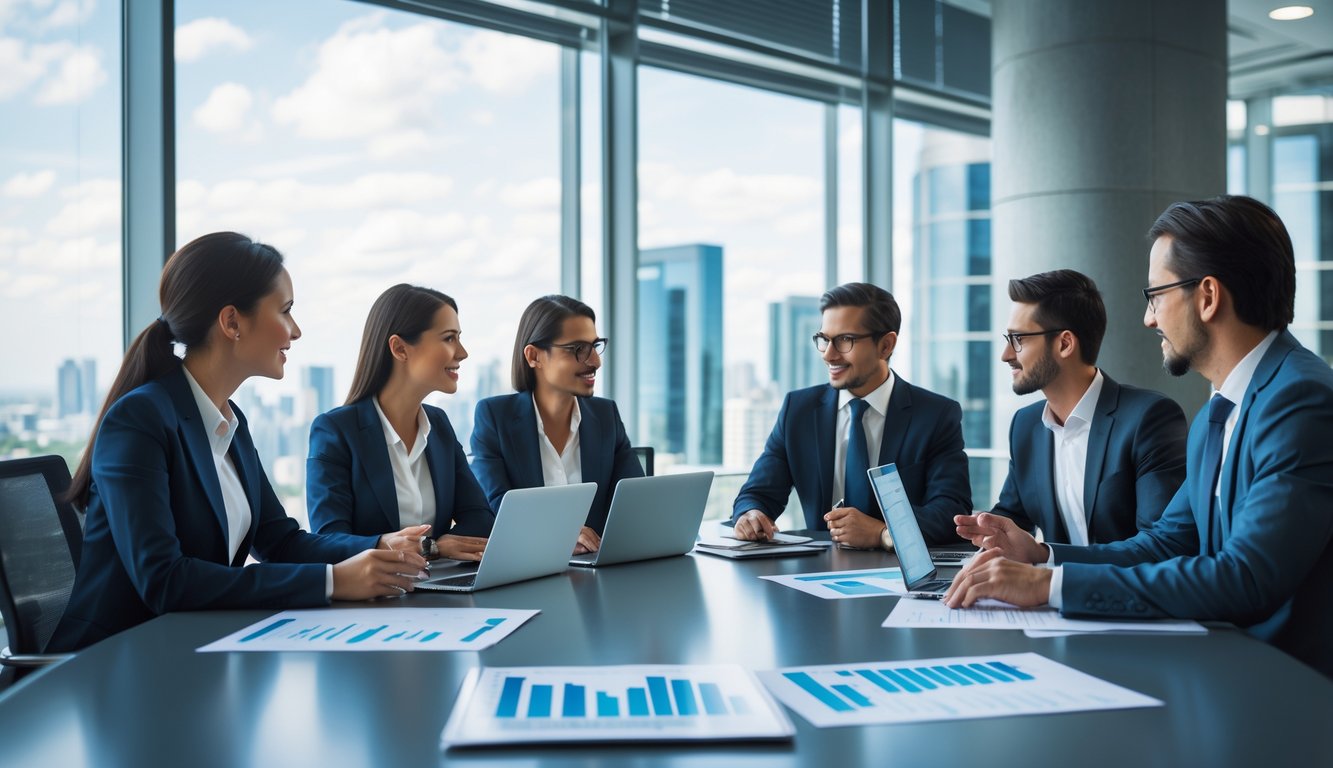 Sekelompok profesional bisnis sedang berdiskusi di sekitar meja konferensi dengan laptop dan dokumen di kantor modern.