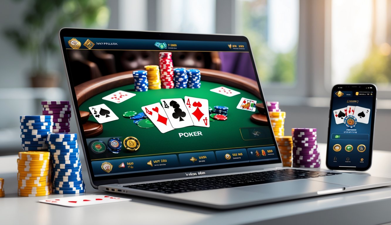 Seorang pemain menggunakan laptop dengan permainan poker online yang terlihat di layar, dikelilingi oleh chip poker dan ponsel di atas meja.